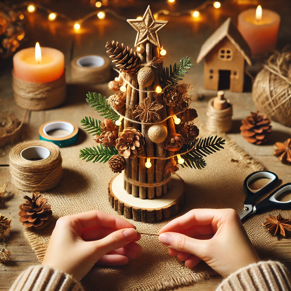 2.나무 조각과 자연 소재를 활용한 미니 크리스마스 트리